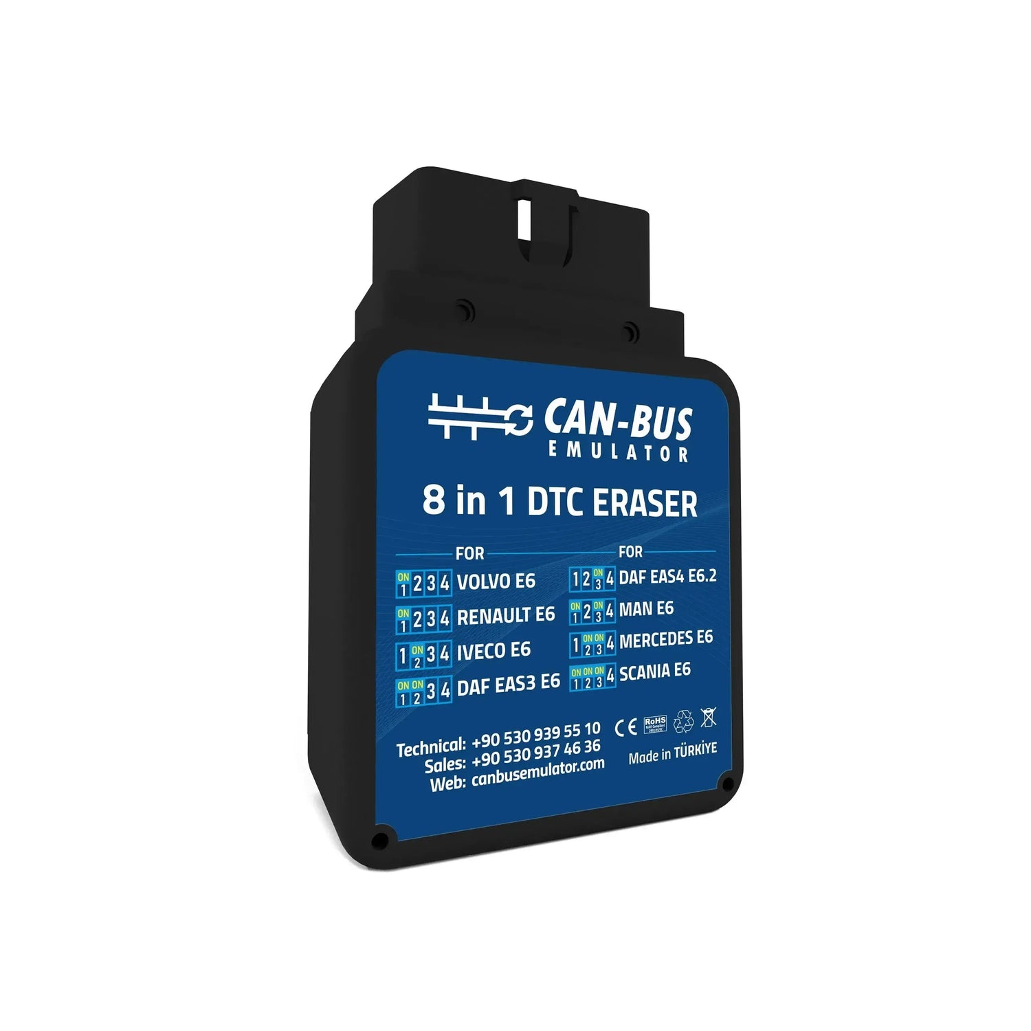 The 8 in 1 Error Code Eraser (DTC) is a diagnostic module designed for clearing fault codes in trucks with Euro 6 and Euro 6.2 engines. The device operates as a stand-alone solution and connects directly to the vehicle’s OBD port. This eraser is compatible with a wide range of vehicle brands, including DAF, Iveco, MAN, Mercedes-Benz, Renault, Scania, and Volvo. By setting the switches on the module correctly, the specific brand protocol is selected, allowing the user to switch flexibly between different vehicles.