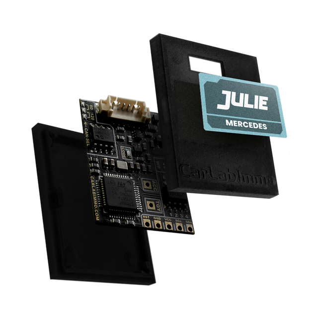 The Julie Mercedes | IMMO OFF & ESL/ELV | Emulator is an electronic module developed for simulating and replacing original vehicle components in Mercedes-Benz systems. The unit replicates the signals of the factory immobilizer (IMMO) and the electronic steering column lock (ESL/ELV). The primary application is to perform diagnostics on start lock issues, test the engine control unit (ECU) outside the vehicle, or temporarily replace a defective ESL/ELV module to make the vehicle startable again.