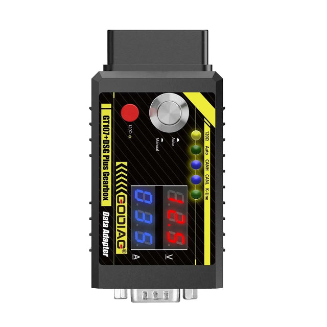 The GoDiag GT107+ is a data-Adapter specifically designed for connecting to the ECU of various DSG transmissions. This device is compatible with a range of transmission ECUs, including the VAG series (DQ200, DQ250, VL381, VL300, DQ500, DL501) and models from brands like Benz and BMW. The Adapter features an integrated digital display showing the current voltage (V) and current (A) of the connected ECU, which helps monitor the status during operation.