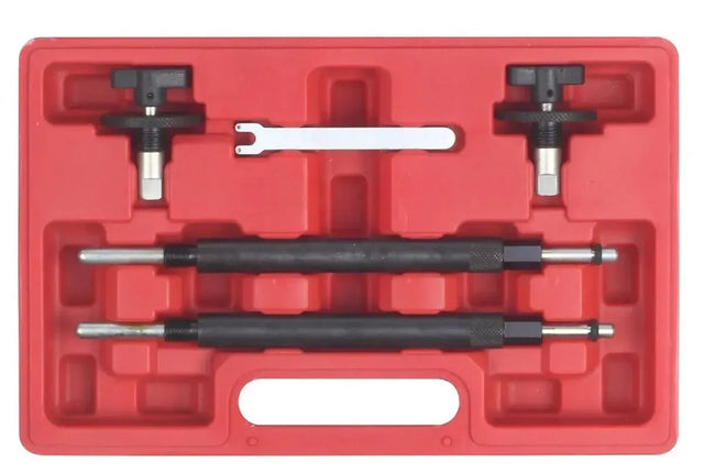 This 5-piece set includes specific tools such as camshaft adjustment tools to fix the camshafts, two piston height adapters to set the pistons at the required height, and a tensioner wrench for correctly tensioning the timing belt. All parts are supplied in a plastic storage case for organization and protection.