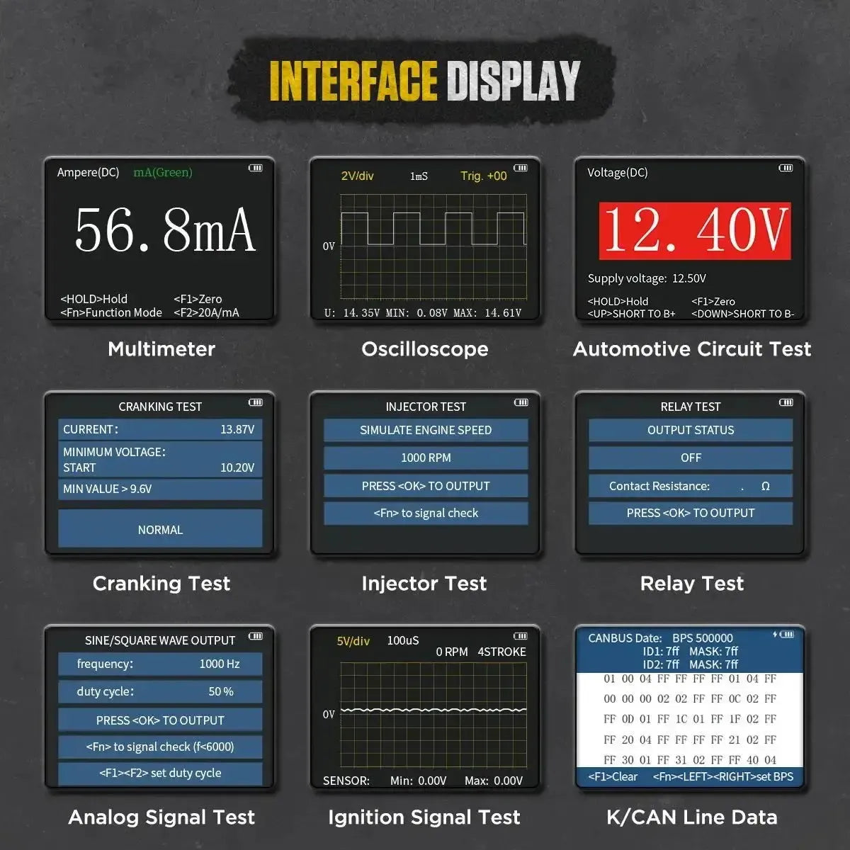 - Oscilloscope: Visualizes electronic signals, such as those from camshaft, crankshaft, and wheel speed sensors, with a bandwidth of 500 kHz.