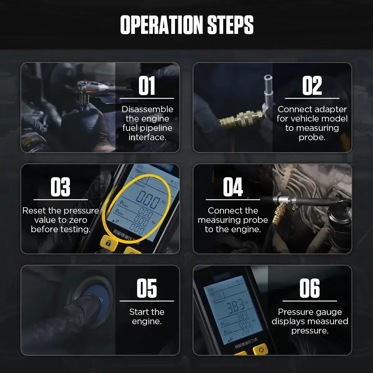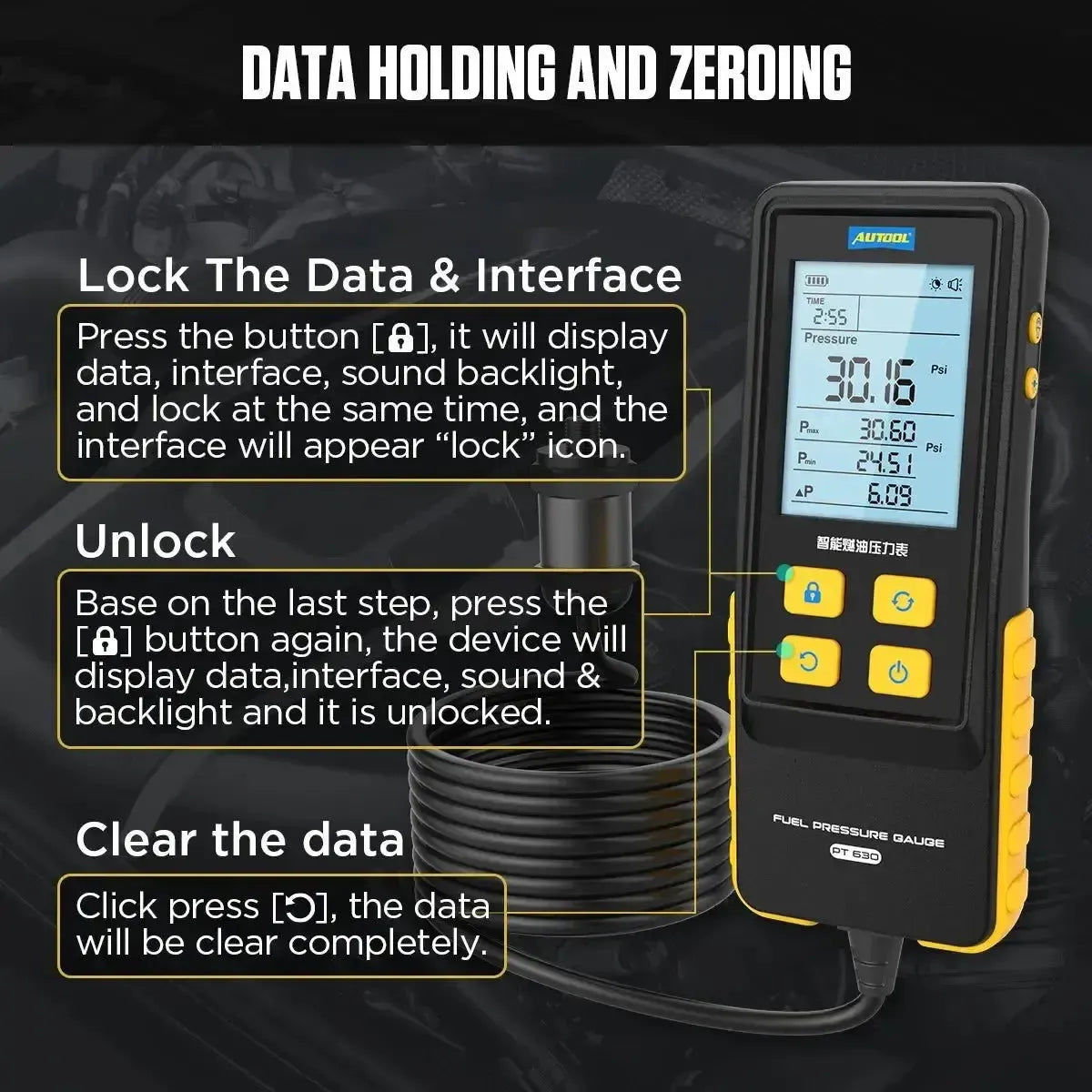 - Multiple units: Easily switches between measurement units bar, psi, kg/cm², Celsius, and Fahrenheit.