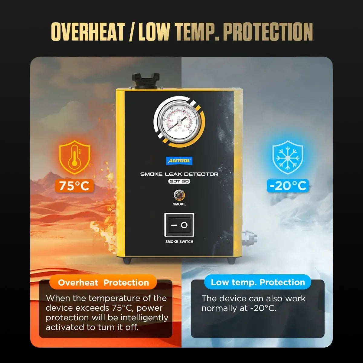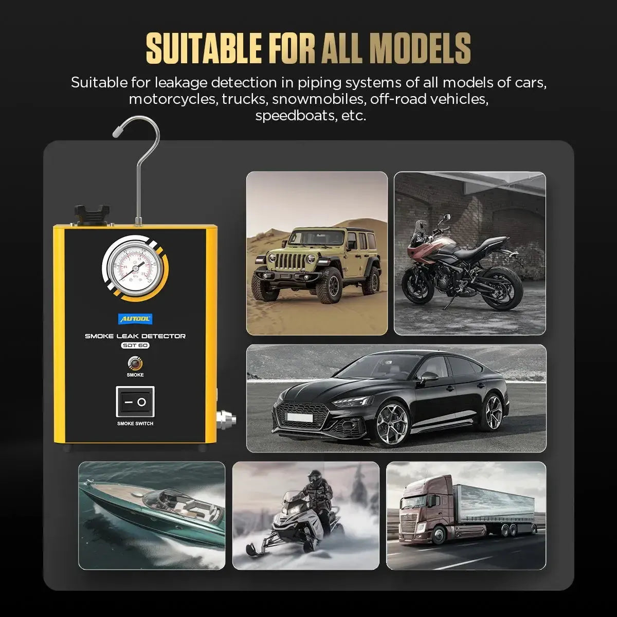 The Autool SDT60 is a Smoke Tester designed for detecting leaks in various piping systems of vehicles. This device operates on a 12V DC vehicle battery and features a built-in air pump, eliminating the need for an external air source. The smoke tester generates smoke through low oxygen combustion and directs it into the system to be tested. An integrated pressure gauge displays the pressure in the system, which helps determine the presence and extent of a leak.