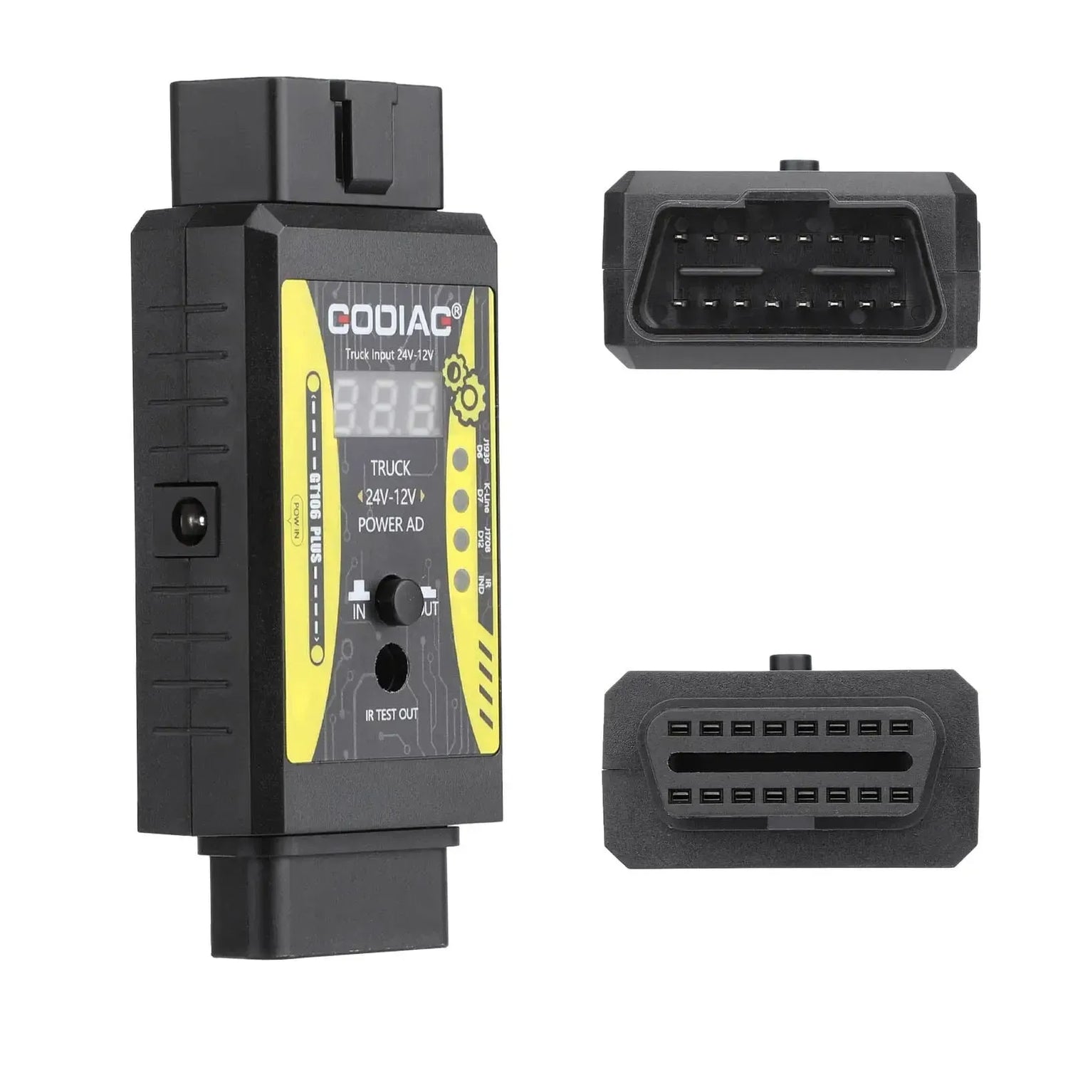 The GoDiag GT106 Plus is a voltage converter specifically designed to convert the 24V power supply of heavy commercial vehicles to a stable 12V output. This makes it possible to connect 12V diagnostic equipment to the OBD2 port of trucks. The module is equipped with a digital display that shows the current voltage and protocol indicators for communication status.