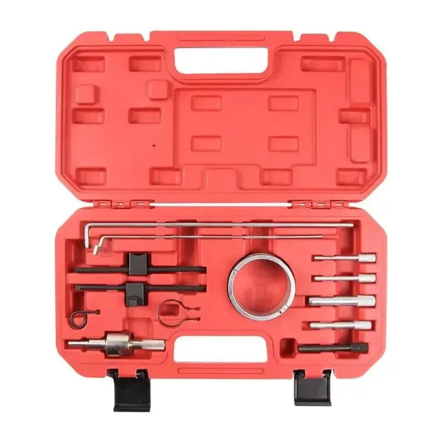 This set contains all necessary Tools, such as locking pins for the camshafts, a flywheel locking tool, and various wrench Tools. Using these instruments ensures the correct engine timing after timing belt replacement, which is essential for engine performance and preventing engine damage.