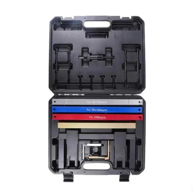 - Locking the camshafts: Fixes the camshafts in the correct position relative to each other and the crankshaft. The set includes multiple templates for compatibility with N51/N52, N53/N54, and N55 engines.