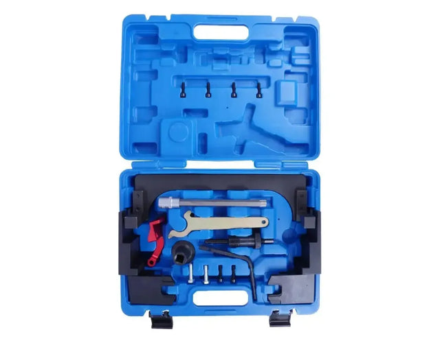 The 19-piece set contains specific Tools for locking the camshafts and the crankshaft in the correct position. Additionally, the set includes parts for pre-tensioning the timing chain and rotating the crankshaft. The components are designed to ensure precise timing, supporting engine performance and reliability.