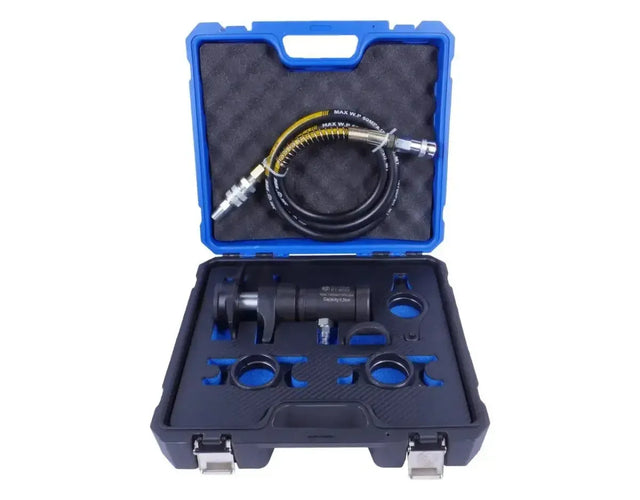 The operation of this ball joint puller is based on a hydraulic cylinder powered by a standard air compressor. This provides controlled and powerful pressure needed to press out tapered connections without damaging surrounding parts. The set comes in a sturdy plastic storage case, ensuring organized storage and easy transport of the tool and accessories.