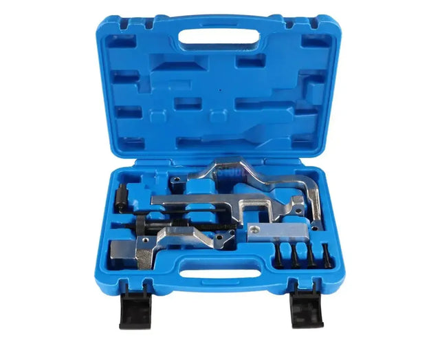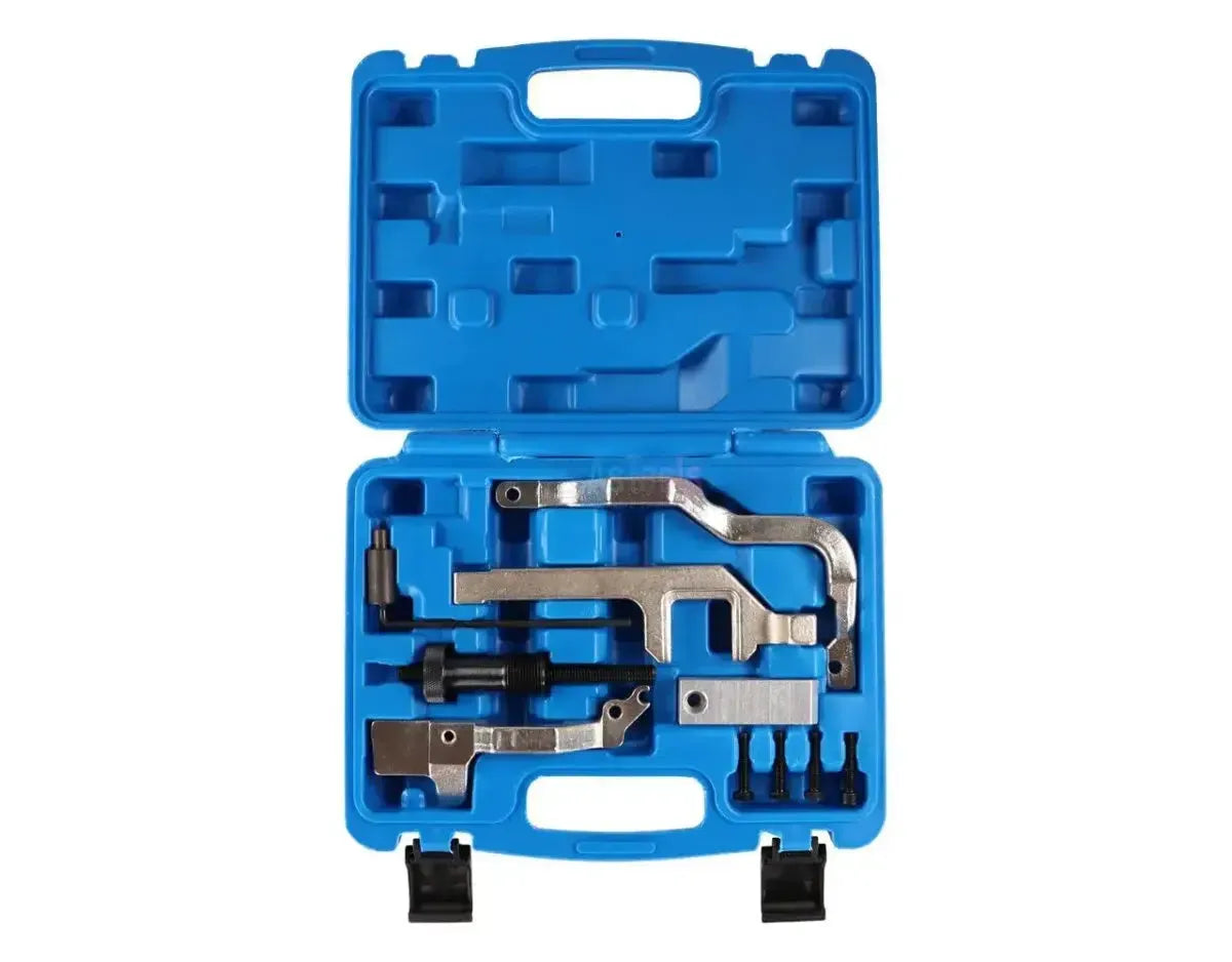 This 10-piece set contains specific tools for fixing the camshafts in the correct position, a locking pin for the crankshaft via the flywheel, and a dummy chain tensioner for correctly setting the chain tension. The set is supplied in a plastic storage case.